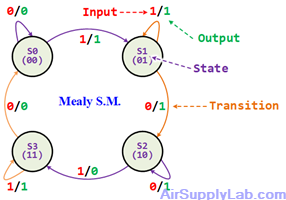 - Transitions: Arrows between states indicate the possible transitions based on input signals. These transitions specify the state change triggered by specific input conditions.