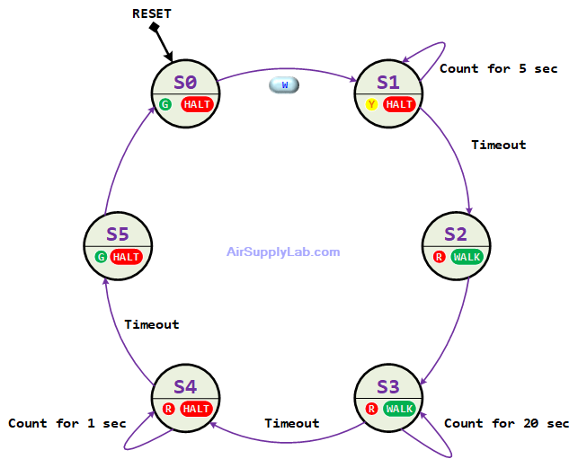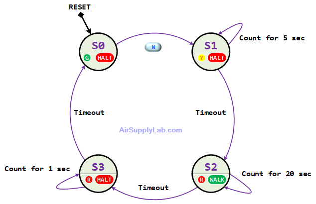- Upon activation of the walk button W, the traffic light transitions from Green to Yellow for a duration of 5 seconds.