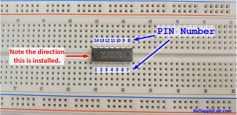 Figure 2.2 illustrates how to place the 7493 chip on the board. It should straddle at the centerline of the breadboard section. The five holes along each vertical row are connected together below the breadboard surface. A chip's pin will occupy one of the holes, so you can connect up to four wires to the same pin on that row (or connect two wires together if there is not a pin from a chip at that row).
