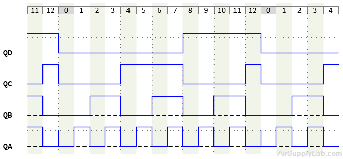 Figure 2.5 shows the timing relationships between the counter outputs. The count values are shown at the bottom of the figure; each one represents the binary pattern in the corresponding vertical slice read from the bottom up; i.e. from QD up to QA. For example, count 7 corresponds to QD, QC, QB, QA = 0 1 1 1.