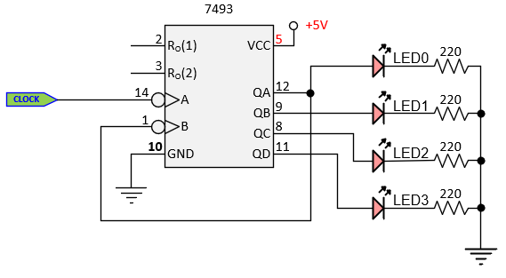 Refer to Figure 2.1 below. The 7493 chip is a 4-bit "modulo-16" counter. "Modulo N" implies that the highest digit is N-1. In this case, N-1 = 15, so the 7493 counts from 0 to 15 (F in hex) and returns to 0 on the 16th count. The counter outputs QD, QC, QB, and QA are displayed on the LEDs, and the RO(1) reset pin (pin 2) is grounded to allow the 7493 to count.