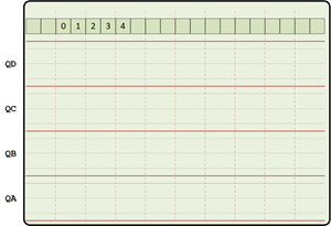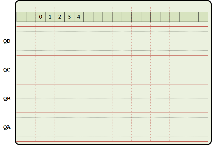 - After you have designed and tested your Mod-N counter, you have to draw the waveforms you observed on the oscilloscope to the figure below. As done in Figures 2.5 and 2.8, stack the waveforms for QA, QB, QC, and QD (even though you can only observe two at a time). You can click on the following Figure, right-click to save the image file to your local disk, then draw the signals on the image file and copy it into your report.