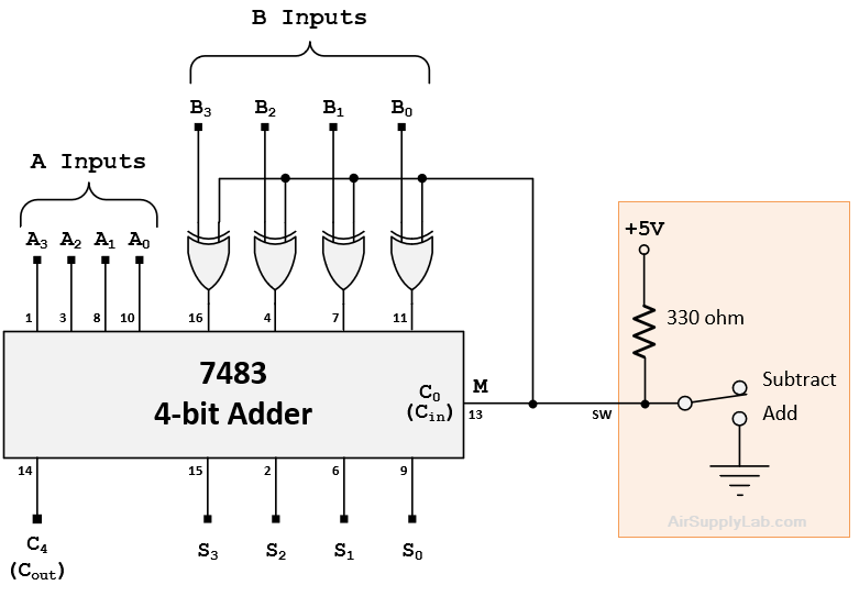 The 0 and 1 at the right are from the 7483's carry input, C0 (Cin) which is connected to M. In the second expression above, M complements the B inputs and adds the 1. The result is A + (B + 1) = A - B. Complementing each Bn is done with an XOR controlled by M: if (M == 0), output = Bn; if (M == 1) , output = Bn.