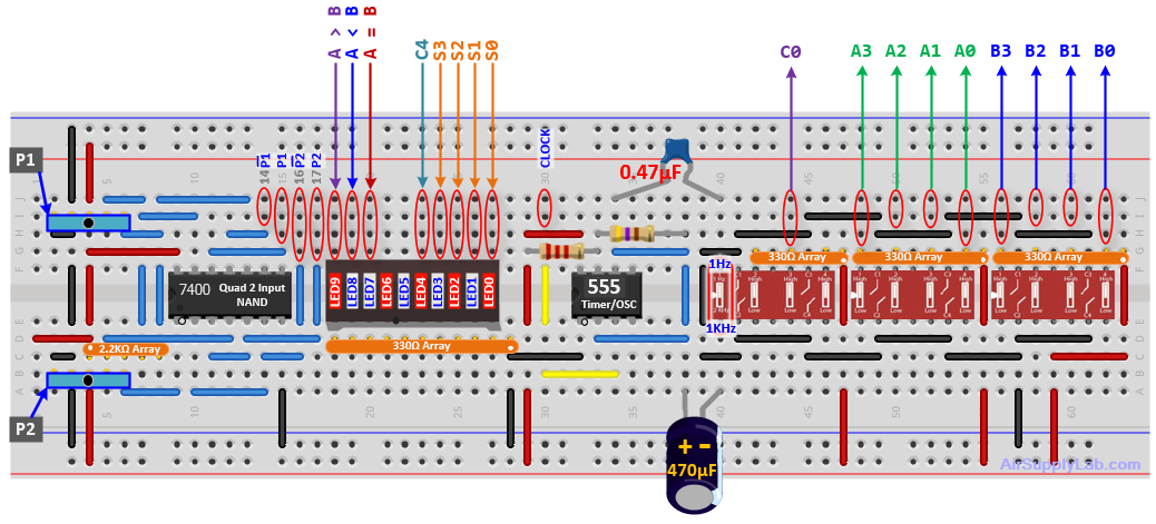 - Start by drawing the circuit to generate "A = B". This output is true only when A - B = 0; i.e. only when (S3…S0) = 0000. Therefore, for this part of the interface block, you must combine inputs S3…S0 using gates so that output "A = B" goes high when S3…S0 are all low. A 4-input NOR would be the perfect solution — if one were available. Instead, you will have to do the design with the gates assigned.