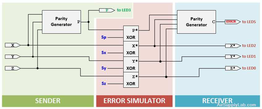In your diagram, show X, Y, Z, and Error Simulator inputs, Sp, Sx, Sy, and Sz, with input port symbols. Same for X*, Y*, and Z*, but with output port symbols. (See port symbols for X and X* in the diagram.) No need for an output port symbol for C since it connects directly to an LED. (To find the LED symbol using KiCad, go to the "Library components" listing, click on the Find button, and type in "Semiconductor - LED"; i.e. Semiconductor (space) hyphen (space) LED. )