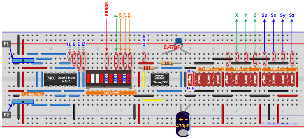 Connect XYZ to three switches and connect the S inputs to four switches, as indicated in the circuit diagram. Test your circuit with all S inputs initially at 0. This simulates normal conditions where patterns are transmitted without error; i.e. P* = P, X* = X, etc.. For each of the 8 patterns of XYZ (000-111) observe the LEDs for P and C. Whenever XYZ has odd (wrong) parity (e.g. XYZ = 010), the parity generator should output P = 1 so transmitted parity is even (1010). Otherwise, P = 0. C should be 'low' all the time, indicating no errors. (Enter your observations into the following table for this test and paste them into your lab report.)
