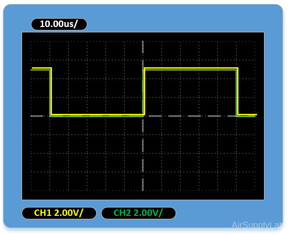 - Connect a Function Generator to the oscilloscope's CH 1 and CH 2 Input terminals. Set input coupling switches to DC for both channels. Set the Function Generator to give a SQUARE WAVE output voltage waveform with a peak-to-peak amplitude of 5 V and a frequency of 10 kHz. The oscilloscope sweep speed should be set to 10.00 μs/DIV. Adjust the vertical controls of both channels so that the two displays overlap precisely.