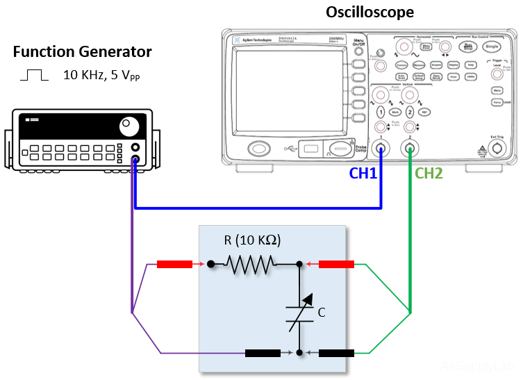 - Increase the capacitance and observe the results on the oscilloscope, then find the time it takes the output voltage to go from zero to 63.2% of the input voltage for four different capacitance values. Decrease the frequency as necessary to display the total transient response curve. Compare the zero to 63.2% rise time with the R-C time constant (i.e., the R-C product). Repeat this procedure for the 100% to 36.8% fall time.