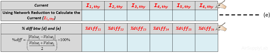 Does the percentage error obtain seem reasonable In view of the accuracy of the DMM? - Using network reduction calculate the theoretical values of all of the branch currents (Using nominal values). Compare the branch current values so obtained with the values obtained by the DMM measurements (in step 5 table (d)). Record your results in the following table.