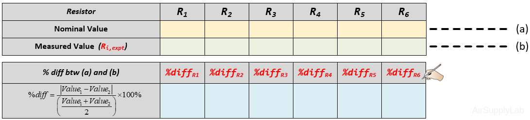 For this experiment, the percent error could not be reported as a fractional difference between a measured value and a theoretical value, because in this case the theoretical is 0 (it is the sum of the voltages around a closed-loop!). Therefore, the percent error (%err) can be calculated by comparing the measured sum of voltage drops to the average of the absolute values of the voltage drops along the closed-loop, that is:
