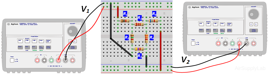 - From the above measurements verify that the superposition theorem is satisfied (Compare the result (1) and (2) in the Data table 2)
