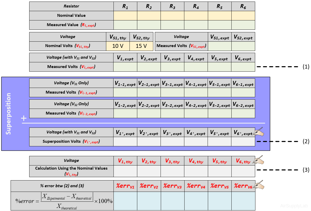 - Using network reduction and the superposition theorem calculate the theoretical values of all of the branch voltages in the circuit (using nominal values) and record the values in Data Table 2. Compare the calculated values with the measured values (Compare the result (2) and (3) in the Data Table 2).