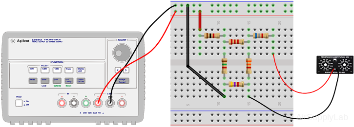 - Construct the Thevenin equivalent circuit using a resistance decade box for RO. Use a DMM for the adjustment of the resistance value of the resistance decade box so that it will be equal to RO.