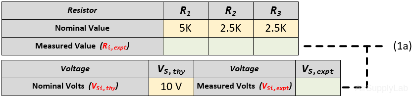 - Measure the actual resistance values and the power supply voltage with a Digital Multimeter (DMM). The display range on the DMM should be chosen so as to obtain the maximum accuracy (i.e. maximum number of digits for the DMM reading). Record your measured values in the table (1a).