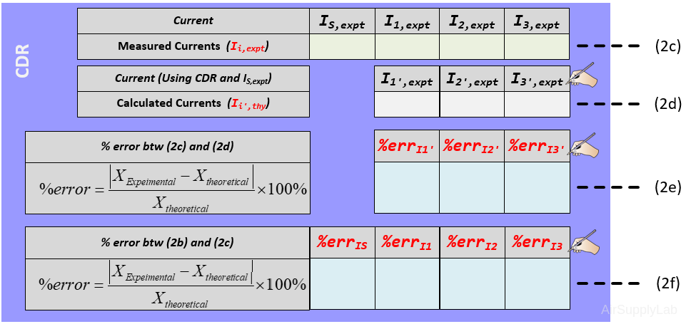 - Measure the IS, I1, I2, and I3 with DMM and record the results in the table (2c). Calculate the currents I1, I2, and I3 using the CDR from the measured value of IS and measured resistance values. Record your calculations in the table (2d). Then calculate the percent differences between (2c) and (2d) into the table (2e). Explain the reasoning behind the values of all the currents.