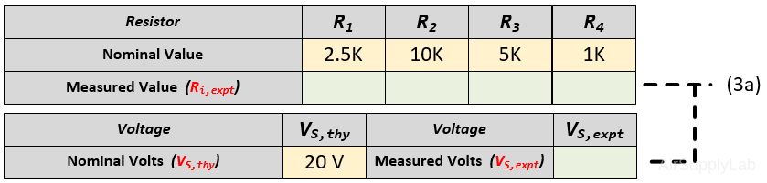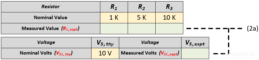 - Measure the actual resistance values and the power supply voltage with a Digital Multimeter (DMM). The display range on the DMM should be chosen so as to obtain the maximum accuracy (i.e. maximum number of digits for the DMM reading). Record your measured values in the table (2a).