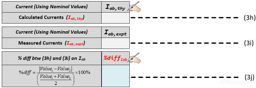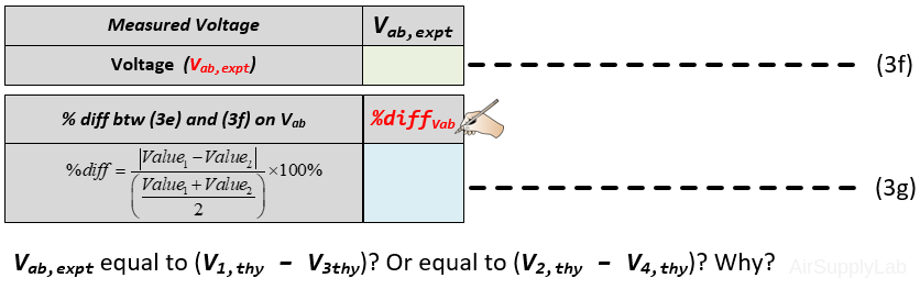 - Measure the voltage Vab using a DMM (DC Voltage mode) and record the value in the table (f). Then use a percent difference to compare the calculated and measured results. How do they compare? Is the voltage Vab,expt equal to V1 – V3? or equal to V2 – V4? Explain your reasoning?
