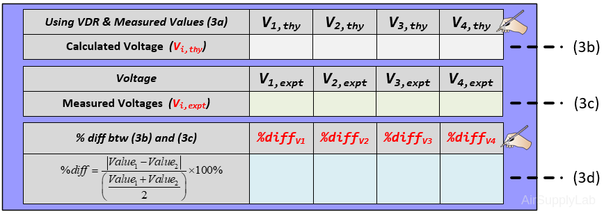 - Calculate V1, V2 and V3 using the VDR with the measured values from table (1a). Measure V1, V2 and V3 and determine the percent difference between the theoretical and experimental results for V1. How do they compare? Record your calculations and measured data in the table (1c), (1d) and (1e.1).