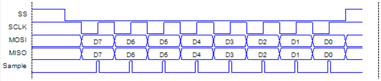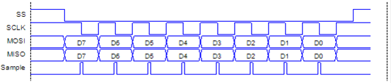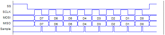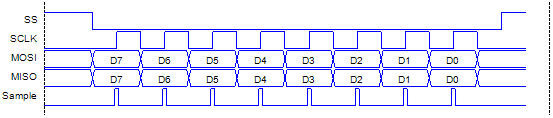 Data is sampled at the leading falling edge of the clock. The data must be available before the first clock signal falls. The clock idle state is high (1). The data on MOSI and MISO lines must be stable while the clock is low and can be changed when the clock is high. The data is captured on the clock's falling transition and propagated on the rising clock transition.