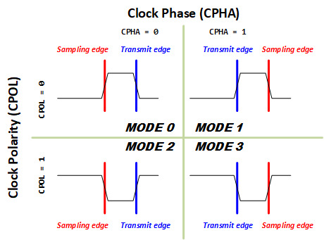 SPI has no pre-defined protocol, so the master and slave must agree on the data frame for the exchange. The data frame is described by clock polarity (CPOL) and clock phase (CPHA). The CPOL parameter defines whether the clock is idle when high or low. The CPHA parameter is used to shift the sampling phase. If CPHA = 0, the data will be sampled on the leading (first) clock edge. If CPHA = 1, the data are sampled on the trailing (second) clock edge, regardless of whether that clock edge is rising or falling. The 4 modes combine polarity and phase according to the following table: