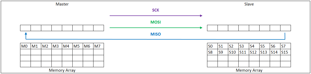 In SPI, the master and slave each contain a shift register, and together they operate as a synchronized circular buffer, exchanging data simultaneously on every clock pulse.