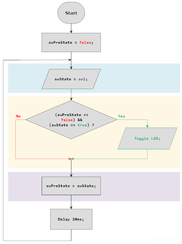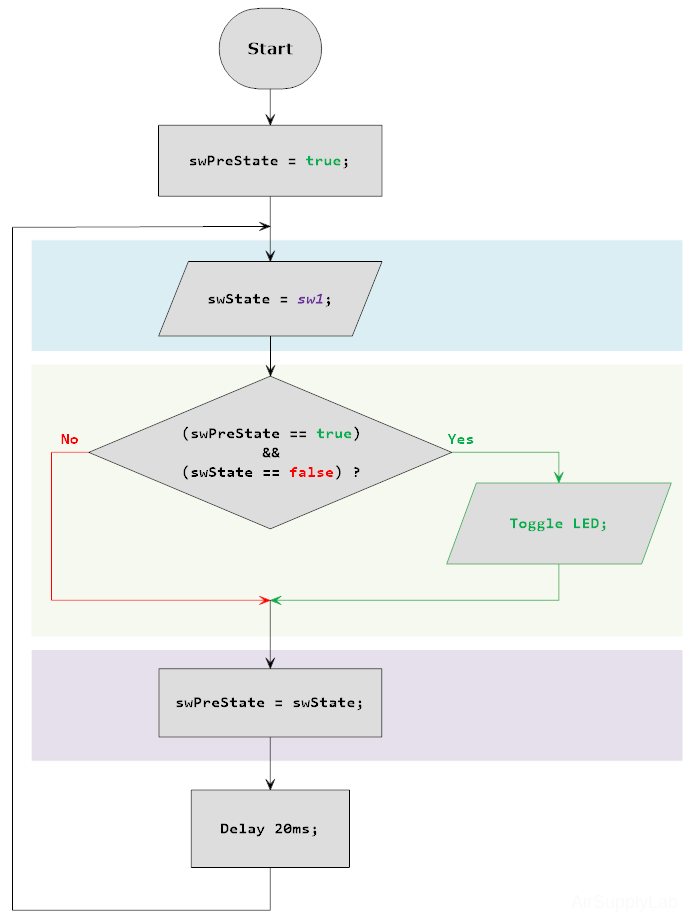 - Update the current state (swState) to the previous state (swPreState), then go to step 1 to check the SW1 button again.