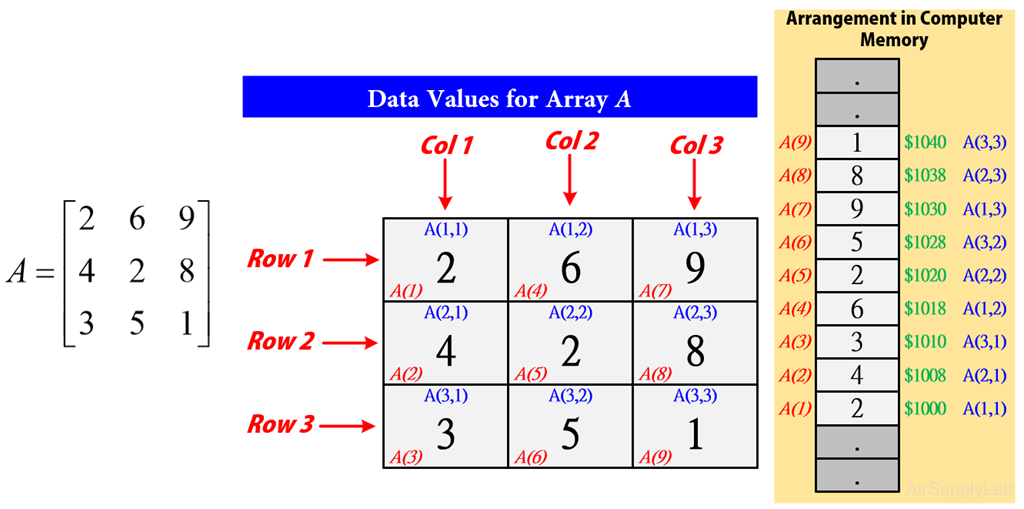 For example, to access the element in the second row, third column of page 2, you can use the subscripts (2,3,2):