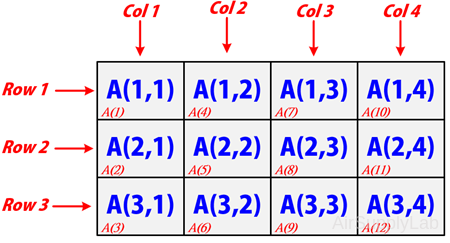 The element at row 3, column 2 of matrix A (A3,2 = 5) can also be identified as element 6 in the actual storage sequence. To access this element, you have a choice of using the standard A(3,2) syntax, or you can use A(6), which is referred to as linear indexing.