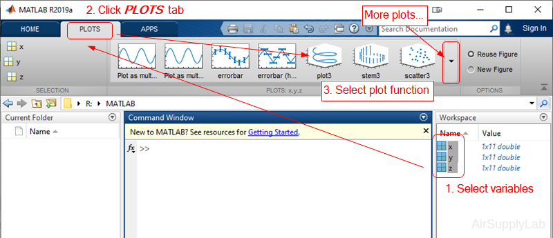 (MATLAB will list the plotting options that are reasonable for the data stored in the variables you selected.) - Select the plotting function to create the plot graph.