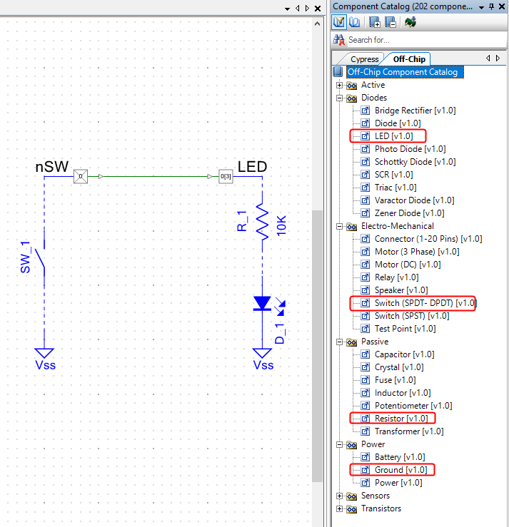 Open the Off-Chip tab on the Component Catalog panel, then drag external components into your schematic, as shown in the following diagram.