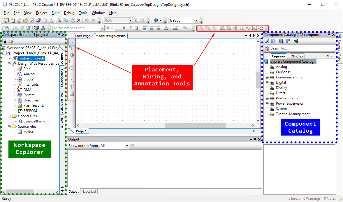 In this lab, users explore controlling an LED with a button using PSoC Creator’s graphical interface, without any C code. This exercise introduces the fundamental concepts of using PSoC's digital input/output pins, internal routing, and basic peripheral configuration. The goal is to demonstrate how configurable logic in the PSoC enables hardware components to communicate without relying on the CPU, thereby creating efficient, low-latency systems.