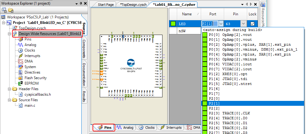 Before building the code, the last thing to do is assign these logical pins to a physical pin on the PSoC 5LP device. To do this, open the Design Wide Resources file (.cydwr) from the Workspace Explorer on the left side of the window. You will get a similar pin assignment window as shown in the following figure: