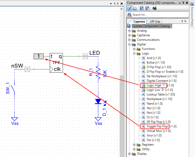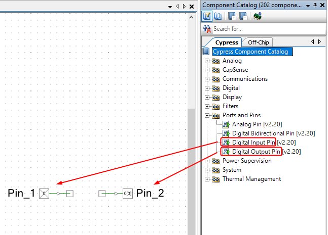 - Select Digital Input Pin and Digital Output Pin from the Ports and Pins catalog under the Cypress tab.