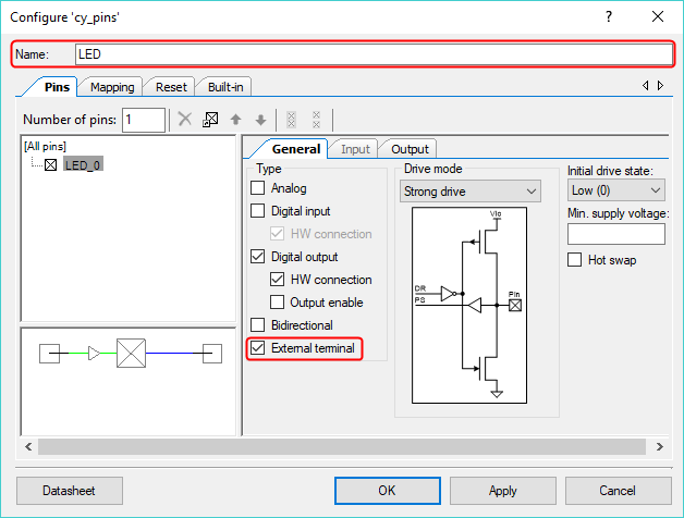 - Perform the same procedure for the output pin, but leave the drive mode at its default setting. Double-click on the Pin_2 component, the output pin.