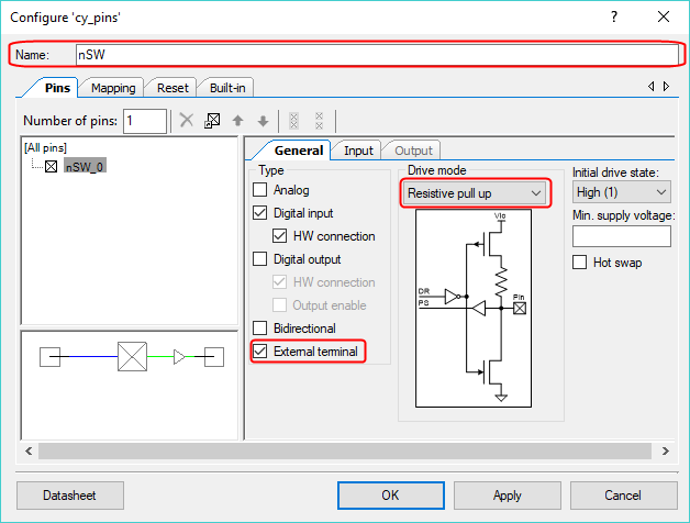 - Why must the Drive mode in nSW (Digital Input Pin) be a Resistive Pull Up? Change the Drive mode to High Impedance Digital, then program the PSoC and see what happens. Explain.