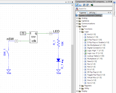 - Is the LED on when the button is pressed and off when it is released? If not, can you just add one more component from the Component Catalog to the Schematic file in the PSoC Creator without changing any physical hardware outside the device? Explain.