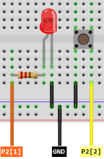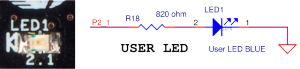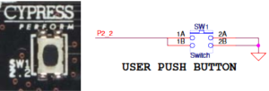 The CY8CKIT-059 board contains a single push button and a blue User LED. The push button connects the GND and the P2[2] pin and the blue user LED is connected to a resistor and P2[1] of the target PSoC 5LP device.