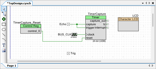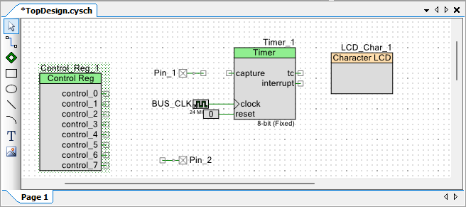 Following these steps, you will successfully add a Character LCD, Timer, Digital Input Pin, Digital Output Pin, and Control Register component to the schematic in PSoC Creator.
