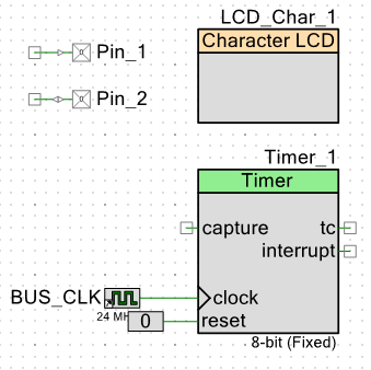 After completing these steps, you have successfully added the Digital Output Pin, a Digital Bidirectional Pin, a Character LCD, and a Timer component to your schematic. You can now proceed to configure each component's parameters and connect them as required for the experiment.