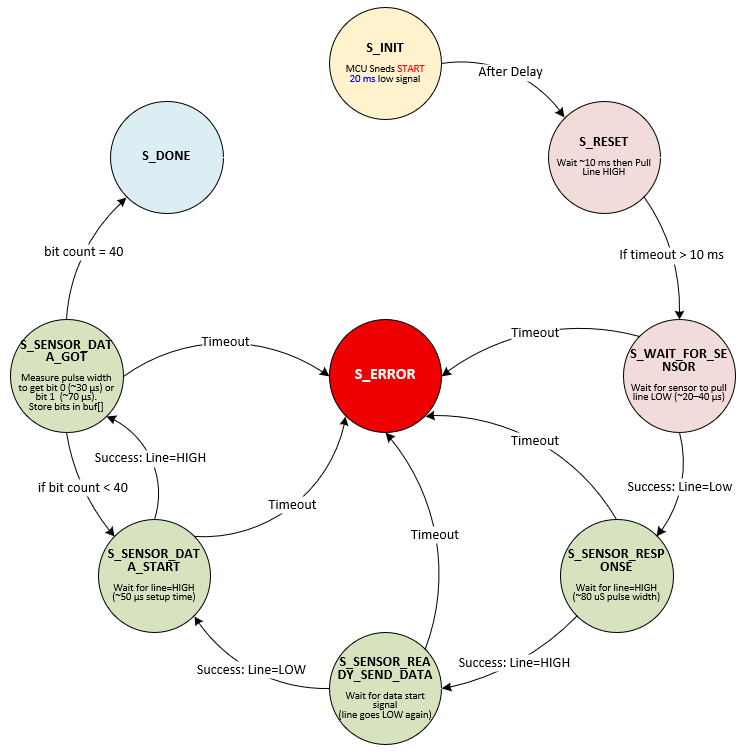 - Data Transfer: Temperature and humidity data are transmitted as 40-bit messages (8 bits each for humidity, humidity decimal, temperature, temperature decimal, and a checksum).