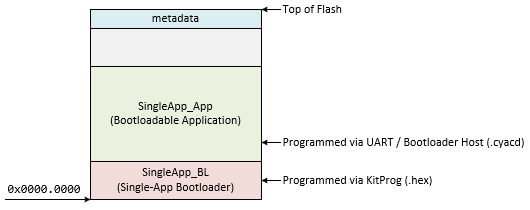 1. Single-Application Bootloader — The simplest configuration. One bootloader project resides at the base of flash, and one bootloadable application occupies the remainder of the flash. The bootloader receives updates from a host and installs them in place of the application.