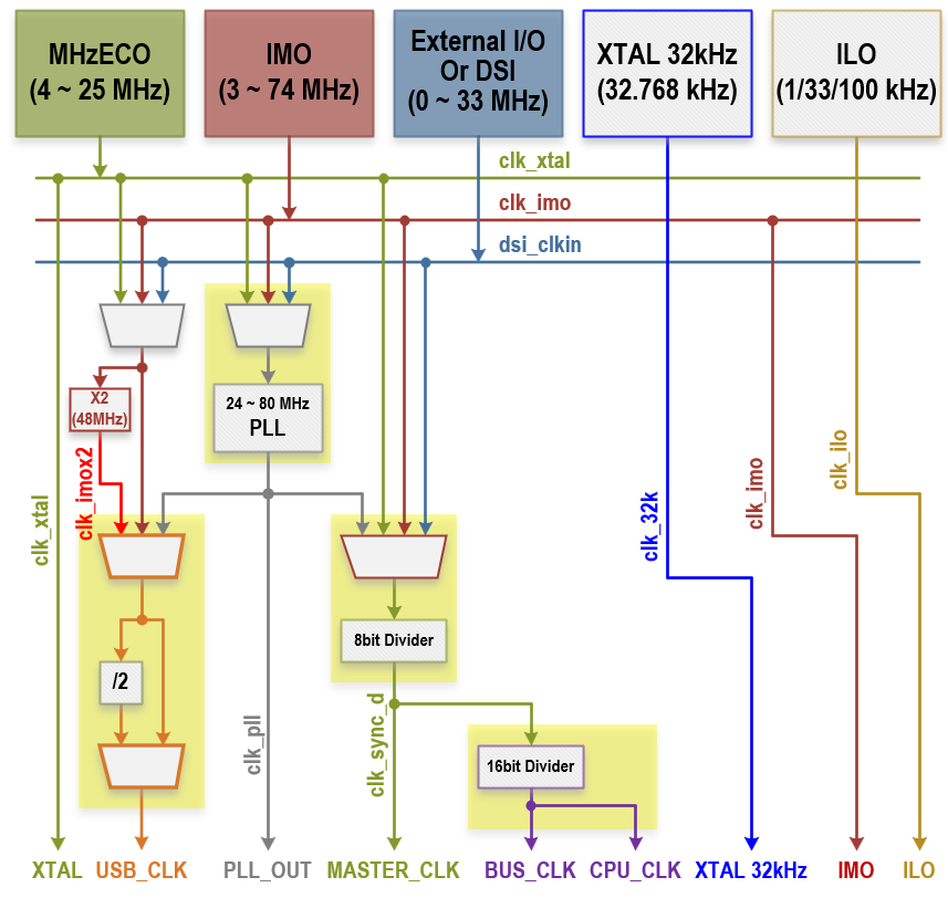 - Master Clock: The primary source for generating all other PSoC clocks (including bus clock). It has the highest or equal frequency to all other PSoC clocks.