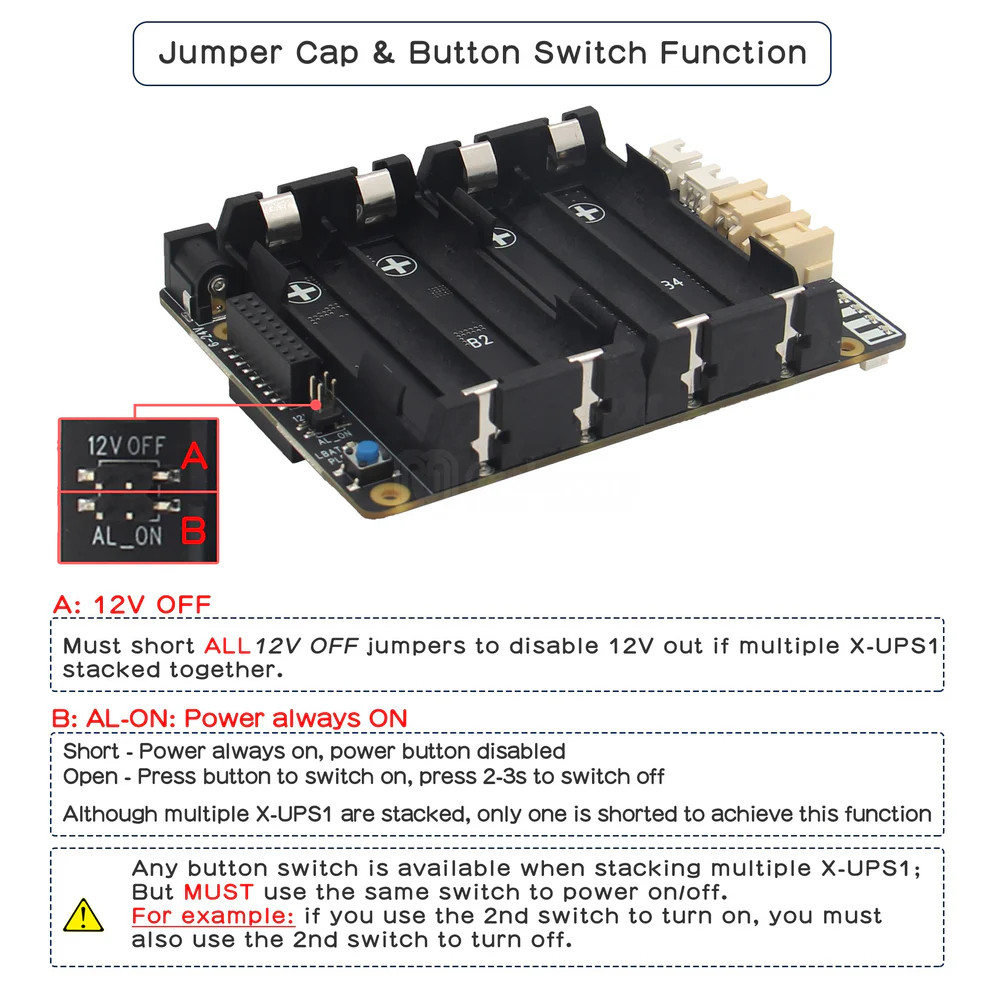 - Only one AL_ON jumper cap should be shorted to enable the Always Power On function when stacking multiple X-UPS1 shields.