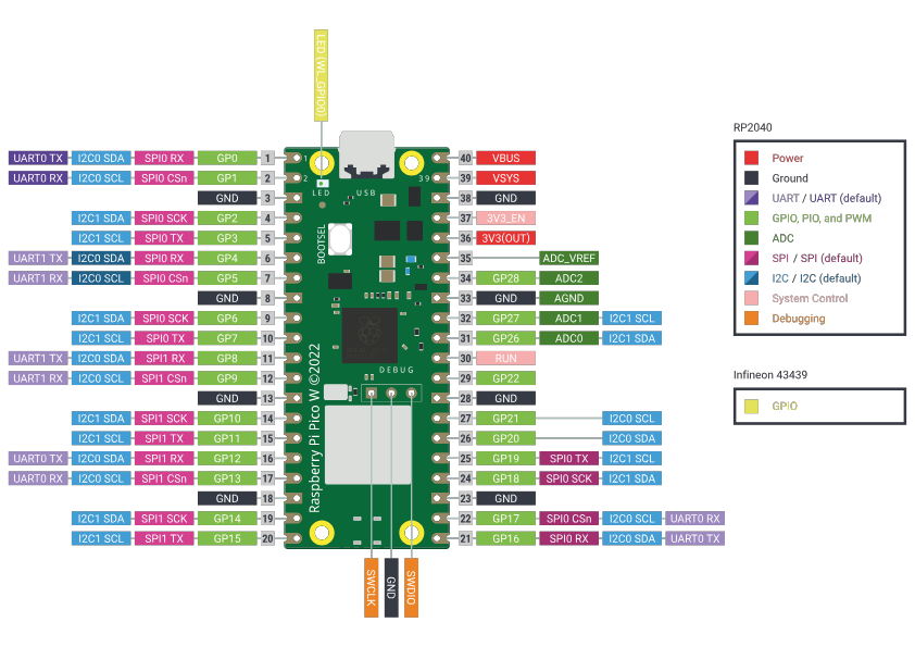 - Wifi: 2.4GHz 802.11n wireless LAN (Raspberry Pi Pico W and WH only)