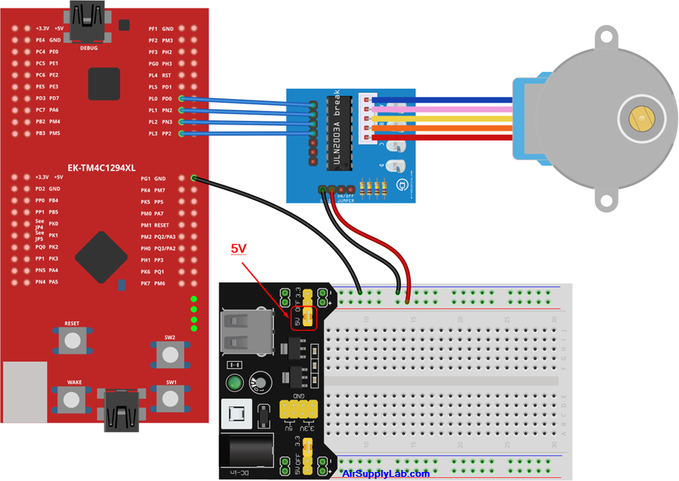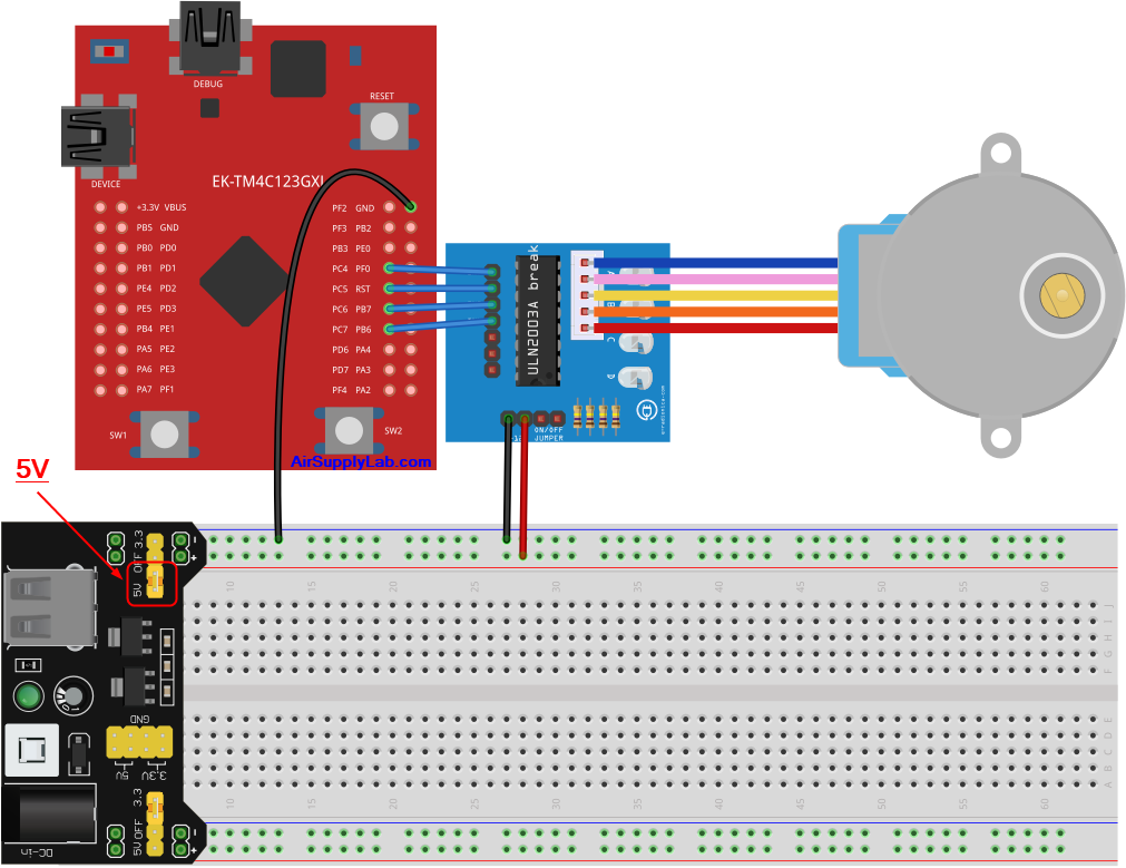 The stepper motor used in this lab is the 28BYJ-48, with gear reduction, providing relatively good torque but slow rotation. The ULN2003A is a Darlington high current transistor array used to drive the 5v stepper motor. The following diagrams are schematics of the internal coils of this stepper motor and how each coil connects to the ULN2003A for each Tiva LaunchPad board. These coils must be connected to the right output of the ULN2003A to ensure correct sequencing.