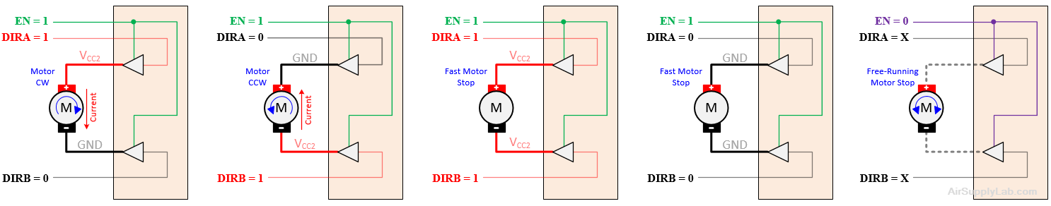 - Change the motor rotation direction: Set the proper output values of DIRA and DIRB to change the direction of the current through the motor.