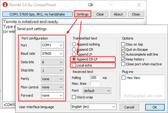 - Windows software for serial communication: [Termite Website] Download Termite 3.4: [exe] [zip]