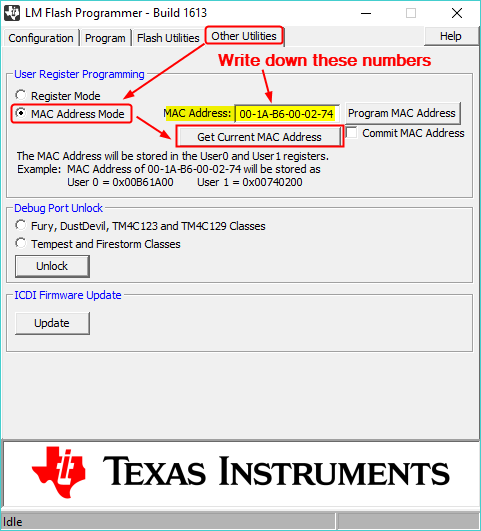 - Click on the Other Utilities tab. Click MAC Address Mode option from the User Register Programming utility. Then click Get Current MAC Address button to read the MAC address from the board.
