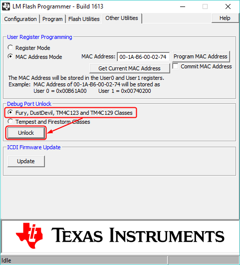 On the TM4C1294 devices, the Ethernet MAC address will be erased by the Debug Port Unlock utility, so be sure to write down the number before running the utility. - For the Tiva devices, select the Fury, DustDevil, TM4C123 and TM4C1294 Classes option from the Debug Port Unlock utility. Then click Unlock button.