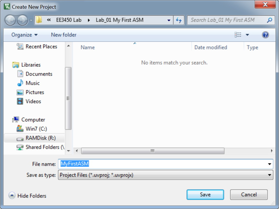 - Select the project folder that you prepared for, give project a name "MyFirstASM", then click on "save" button